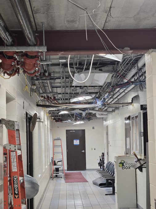 •The remodel of the law enforcement center will be done in three phases. The first phase has begun. On the ground floor of the building, the ceiling panels are out.